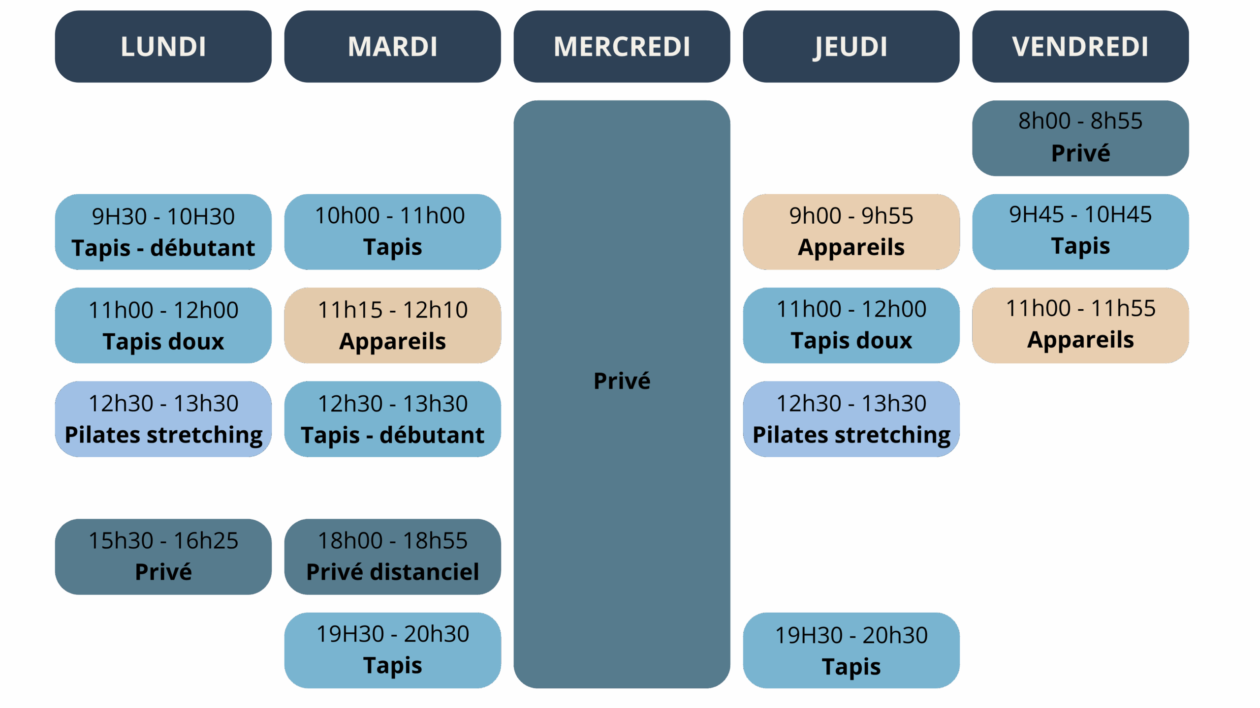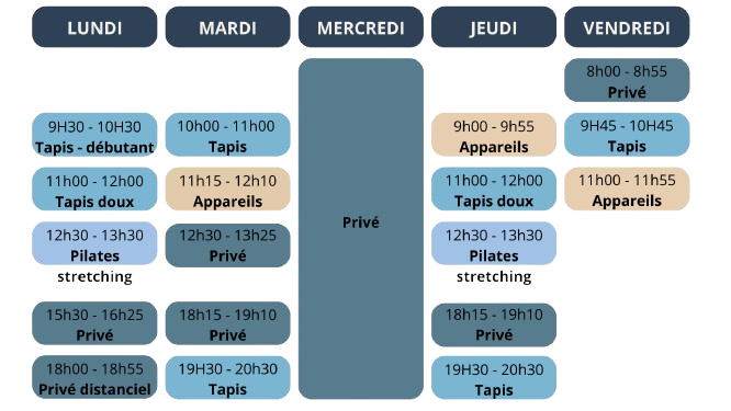 - les cours privés et appareils (4 élèves max) durent 55 min.